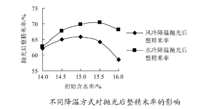 不同的降溫方式對大米加工機械出品整米率的影響。糙米在經大米加工設備碾白的過程中由于受到擦離摩擦以及碾削等作用力而導致米溫升高的現(xiàn)象,如果對溫度較高的大米直接進行拋光等處理不僅會增加能耗,還會降低碎米率,因此,需要對出機的高溫米粒進行降溫。降溫的方式主要有兩種:水冷降溫和風冷降溫,這兩種降溫方式對大米加工機械整米率的影響結果如下圖所示: